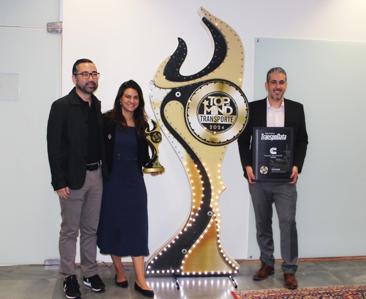 Foto | Cummins/Divulgação - Da esq. p/ dir.: Adriano Rishi, presidente da Cummins Brasil, Luciana Machado, gerente executiva de comunicação da Cummins Brasil e Rafael Torres, diretor executivo de engenharia da Cummins Latam